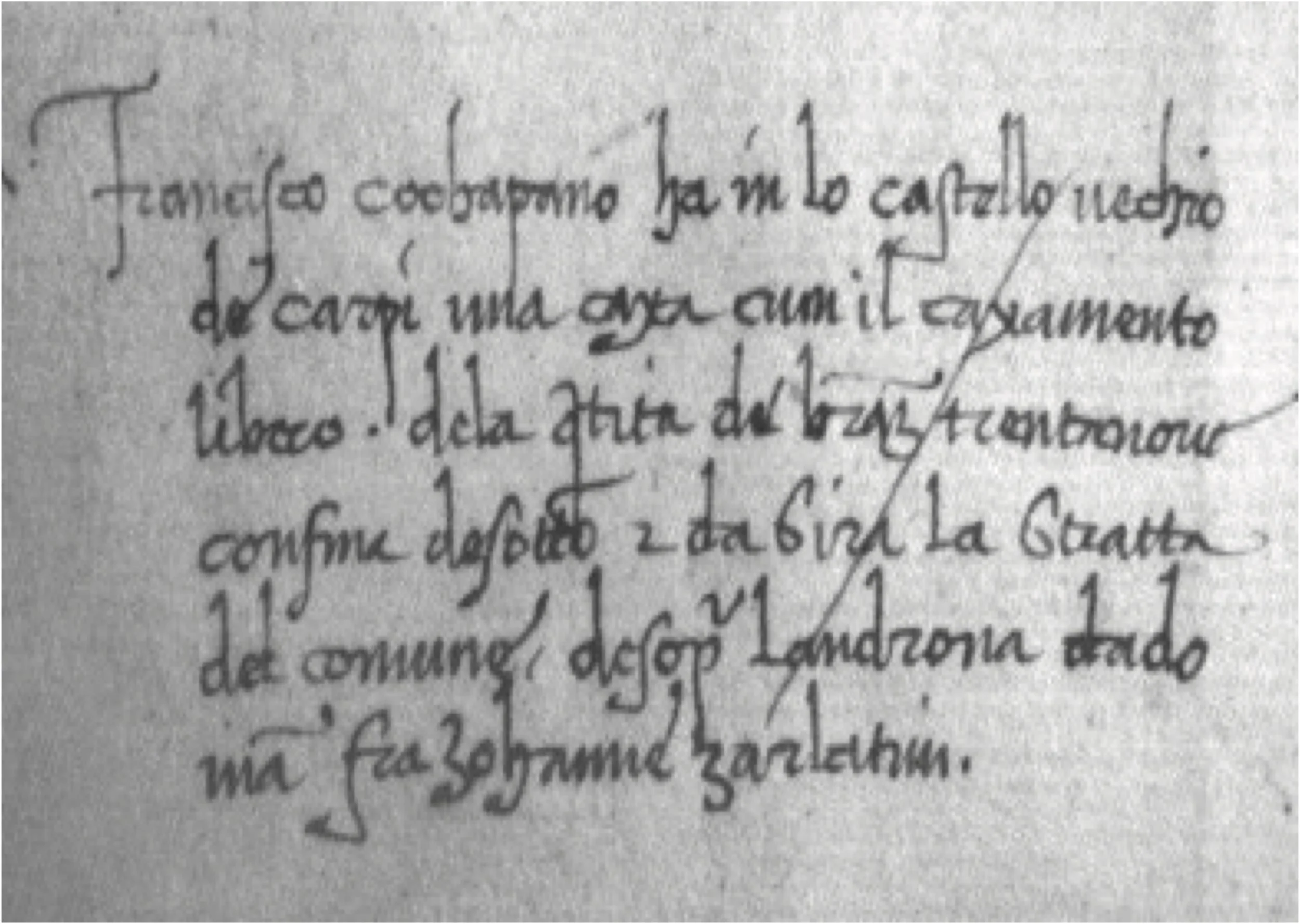 Francisco Cochapano ha in lo castello vechio de carpi una caxa cum il caxamento libero de la quantità de braza trentanove confina de sotto e da sira la stratta del comune, de sopra l’androna da doman fra Zohanne Zarlatini